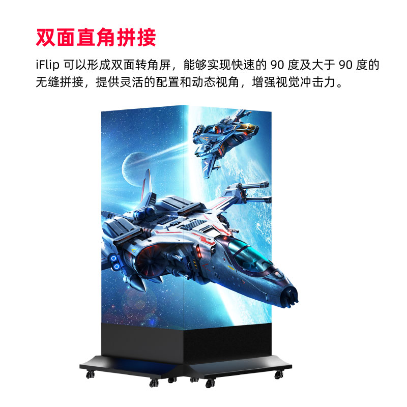 iFlip 是一款多功能 LED 折叠广告机,具有无缝组装的平滑显示效果,且可折叠设计适合放入航空箱,确保易于在汽车和建筑中运输。它非常适用于各种场所,如酒店、培训室、礼堂、教堂、学校和交通枢纽。